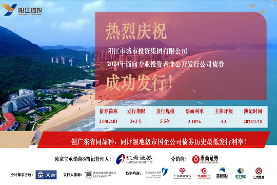 2024年1月19日,市城投集團在深圳證券交易所成功發行“陽江市城市投資集團有限公司2024年面向專業投資者非公開發行公司債券”。本期債券發行規模為5.5億元,期限為5(3+2)年,票面利率3.10%,全場認購倍數超過4.8倍,是...